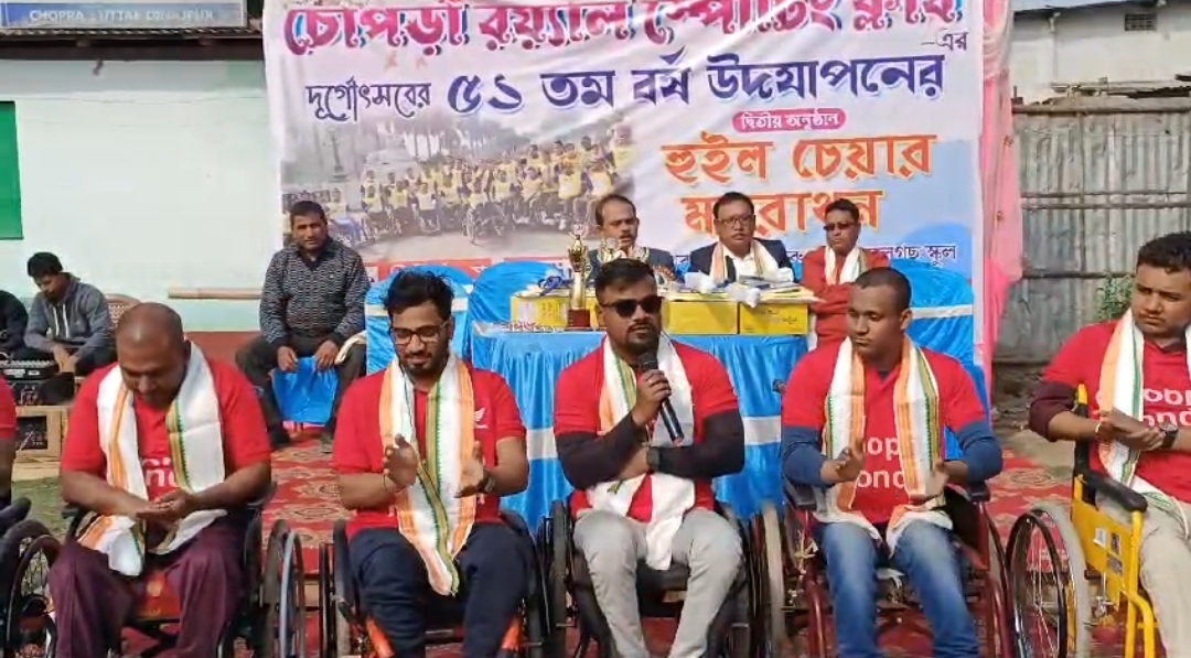 চোপরা রয়েল স্পোর্টিং ক্লাবের ৫১ তম দুর্গোৎসব উপলক্ষে এই প্রথমবার চোপড়ায় অনুষ্ঠিত হল হুইল চেয়ার ম্যারাথন দৌড় প্রতিযোগিতা। রবিবার এই ম্যারাথন দৌড় প্রতিযোগিতাটি শুরু হয় সুফল গজ প্রাইমারি স্কুল থেকে শেষ হয় চোপড়া থানা মাঠে এসে । এই ম্যারাথন দৌড় প্রতিযোগিতায় প্রথম হন ঘাটালের বাসিন্দা অপূর্ব সেমন্ত । দ্বিতীয় হন হাওড়ার প্রীতম ম্যার্ধা ও তৃতীয় হন কার্শিয়াং এর সুরেন প্রধান । এদিন রাস্তার দু’ধারে অসংখ্য মানুষ হাততালি দিয়ে ঐ ম্যারাথন দৌড়ে অংশগ্রহণকারীদের উৎসাহ প্রদান করেন । চোপড়া হাই স্কুলের প্রধান শিক্ষক প্রশান্ত বসাক বলেন, আমি বিভিন্ন ম্যারাথন দৌড় দেখেছি কিন্তু হুইল চেয়ারে বসেও যে ম্যারাথন দৌড় করা যায় এটি আমি আমার জীবনে প্রথম দেখলাম তবে আমি খুব আনন্দিত ।