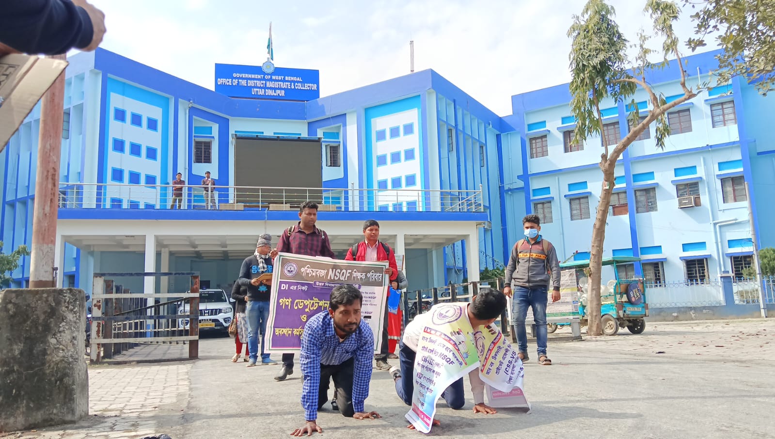 হামাগুড়ি দিলেন জেলাশাসকের অফিসের সামনে শিক্ষকরা । বৃহস্পতিবার এমনই এক দৃশ্য চোখে পড়লো উত্তর দিনাজপুরের রায়গঞ্জে জেলা শাসকের অফিসের সামনে। ন্যাশনাল স্কিলস কোয়ালিফিকেশন ফ্রেমওয়ার্ক শিক্ষক,শিক্ষিকা ও ল্যাব অ্যাসিস্ট্যান্টরা কর্ণজোড়া বাসস্ট্যান্ড থেকে জেলাশাসকের দপ্তর পর্যন্ত মিছিল করে আসে তারপর জেলা শাসকের অফিসের সামনে বেশ কিছুক্ষন বিক্ষোভ দেখাতে থাকেন। তারপরেই হঠাৎ করে শিক্ষকরা জেলা শাসকের দপ্তরের মধ্যে হামাগুড়ি দিতে থাকে এবং পরবর্তীতে হামাগুড়ি দিতে দিতে ডেপুটেশন দিতে যায় । বিক্ষোভে উপস্থিত ছিলেন জেলার ৩৫ জন শিক্ষক,শিক্ষিকা ও ল্যাব অ্যাসিস্ট্যান্টরা ।