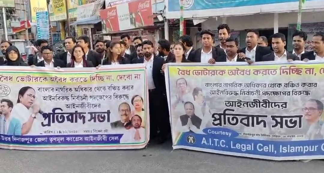 “বৈধ ভোটারকে অবৈধ করতে দিচ্ছি না, দেব না” — এই স্লোগানকে সামনে রেখে রাজ্যের আইন মন্ত্রী চন্দ্রীমা ভট্টাচার্য মহাশয়ার নির্দেশে বাংলার নাগরিক অধিকার কেড়ে নেওয়ার লক্ষ্যে নেওয়া আইনবিরুদ্ধ নির্বাচনী পদক্ষেপের বিরুদ্ধে জোরালো প্রতিবাদে সামিল হলেন আইনজীবীরা। মঙ্গলবার ইসলামপুর মহকুমা আদালতের অল ইন্ডিয়া তৃণমূল কংগ্রেস লিগেল সেল-এর পক্ষ থেকে এই কর্মসূচি গ্রহণ করা হয়।