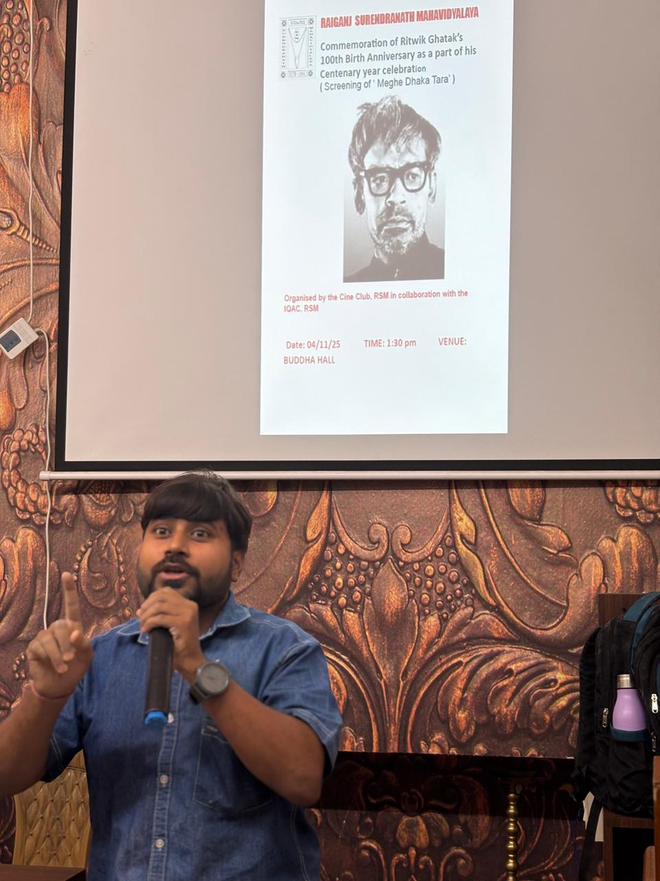রায়গঞ্জ সুরেন্দ্রনাথ মহাবিদ্যালয়ের Cine Club-এর উদ্যোগে এবং IQAC-এর সহযোগিতায় কিংবদন্তি চলচ্চিত্রকার ঋত্বিক ঘটক-এর জন্মদিন উপলক্ষে তাঁর অমর সৃষ্টি ‘মেঘে ঢাকা তারা’ চলচ্চিত্রটির প্রদর্শন অনুষ্ঠিত হয়।